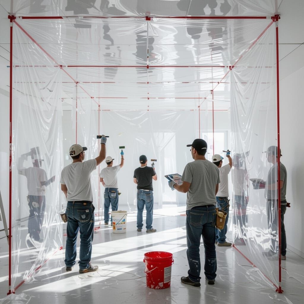 A naturally lit interior view shows workers painting a white ceiling. Transparent plastic film and red rods create a partition in this minimalist design reminiscent of mid-century modern architecture.