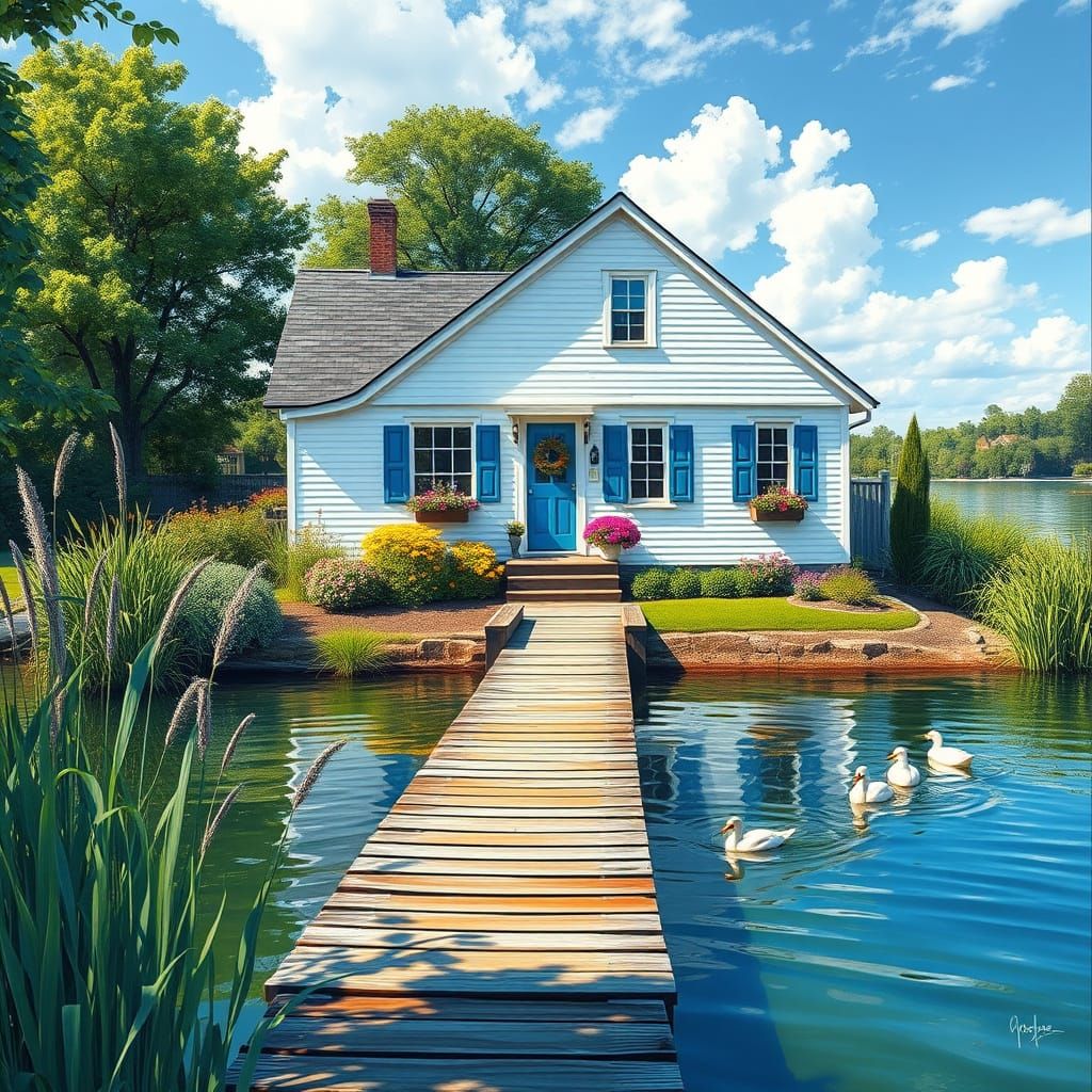C'est une belle journée , une belle maison blanche aux volets bleus , elle est installée au bord d'un lac , un petit ponton en bois s'avance sur le lac , quelques canards sont sur le lac , en bordure de lac quelques joncs et devant la maison des jolis massifs de fleurs , réaliste