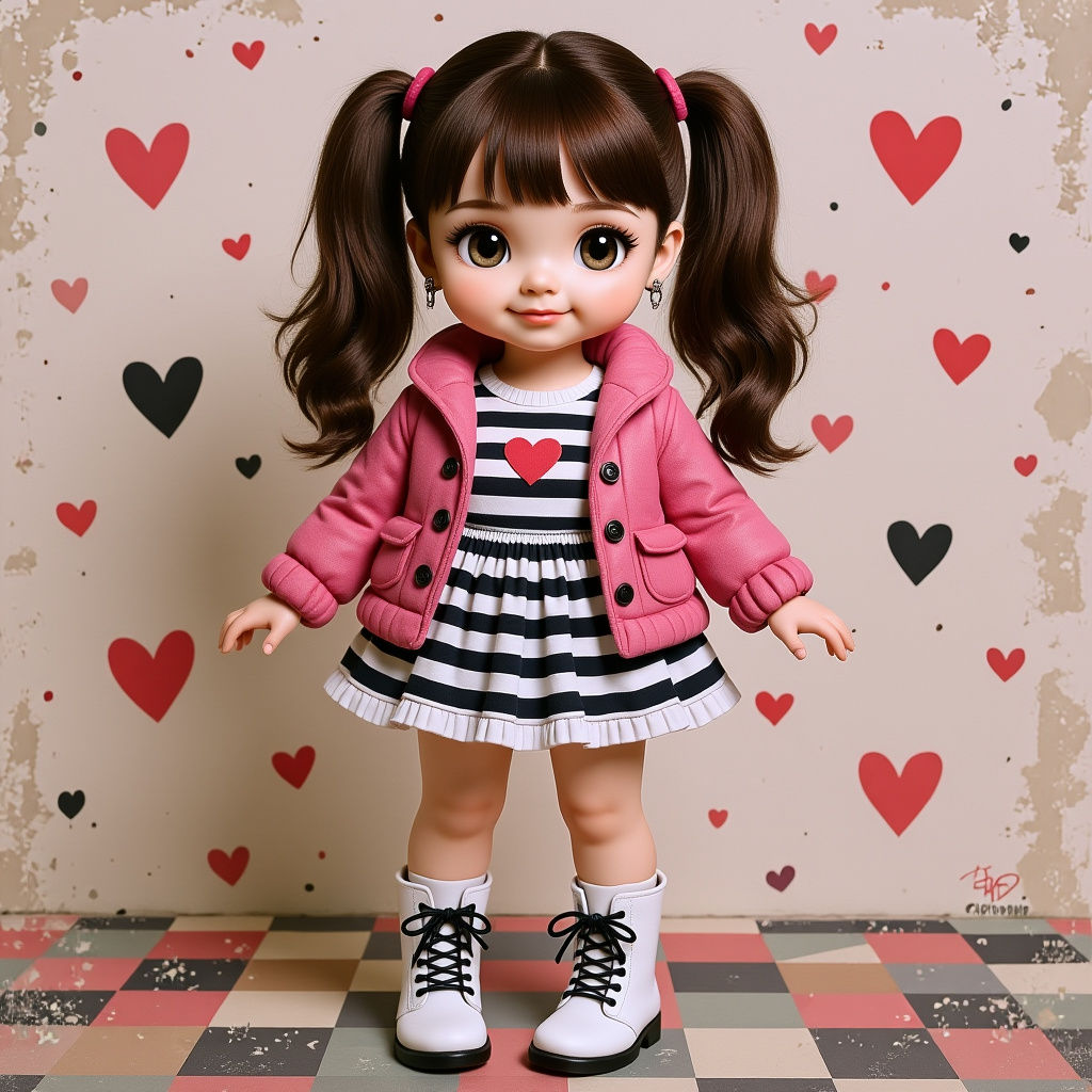 This image shows an American doll with brown hair, styled in a ponytail, wearing a black and white striped dress adorned with heart drawings. The doll is also wearing a pink knitted jacket.