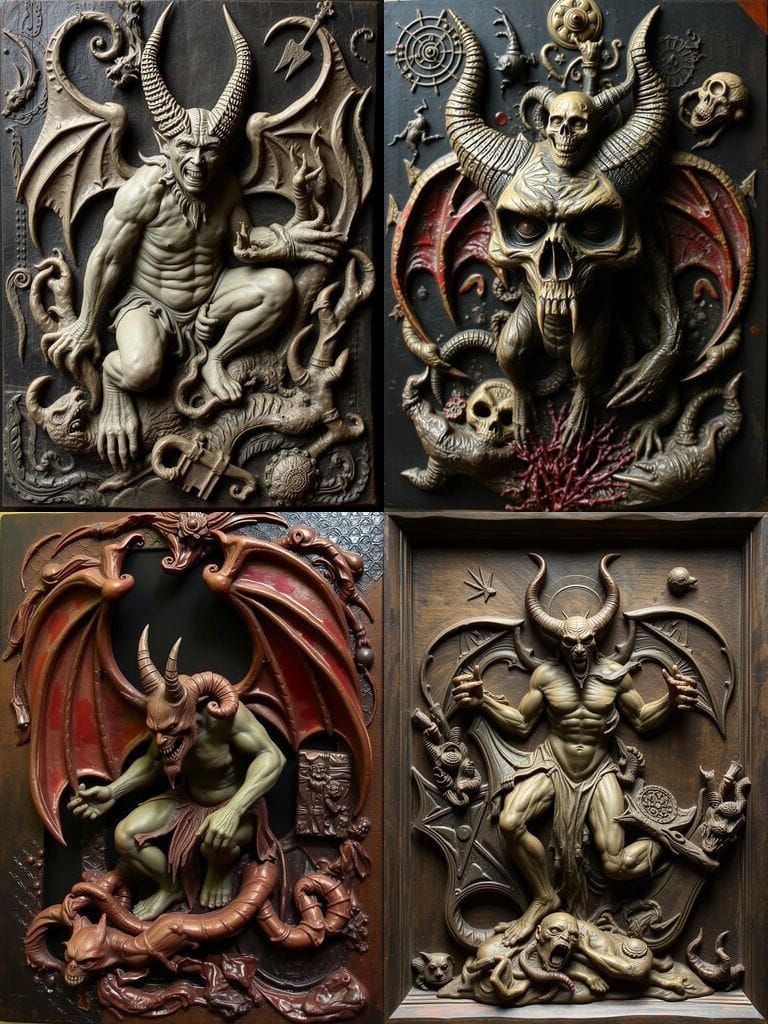 A haunting mixed media artwork depicting the Devil's benevolent side, blending elements of horror and fantasy in a surreal, nightmarish scene.