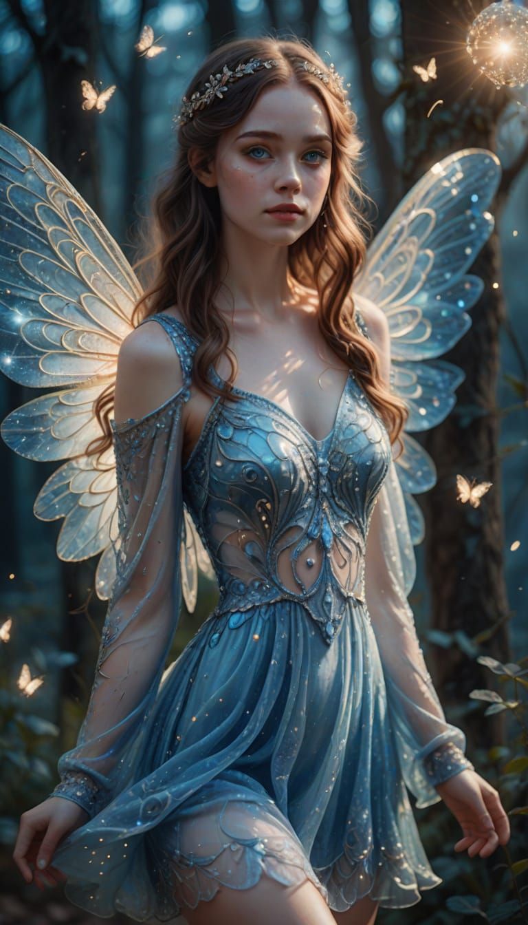 This enchanting portrait features a beautiful woman with fairy wings, intricate details, and a sparkly dress, set against a soft, golden lighting with a blue tint, evoking a warm summer evening.