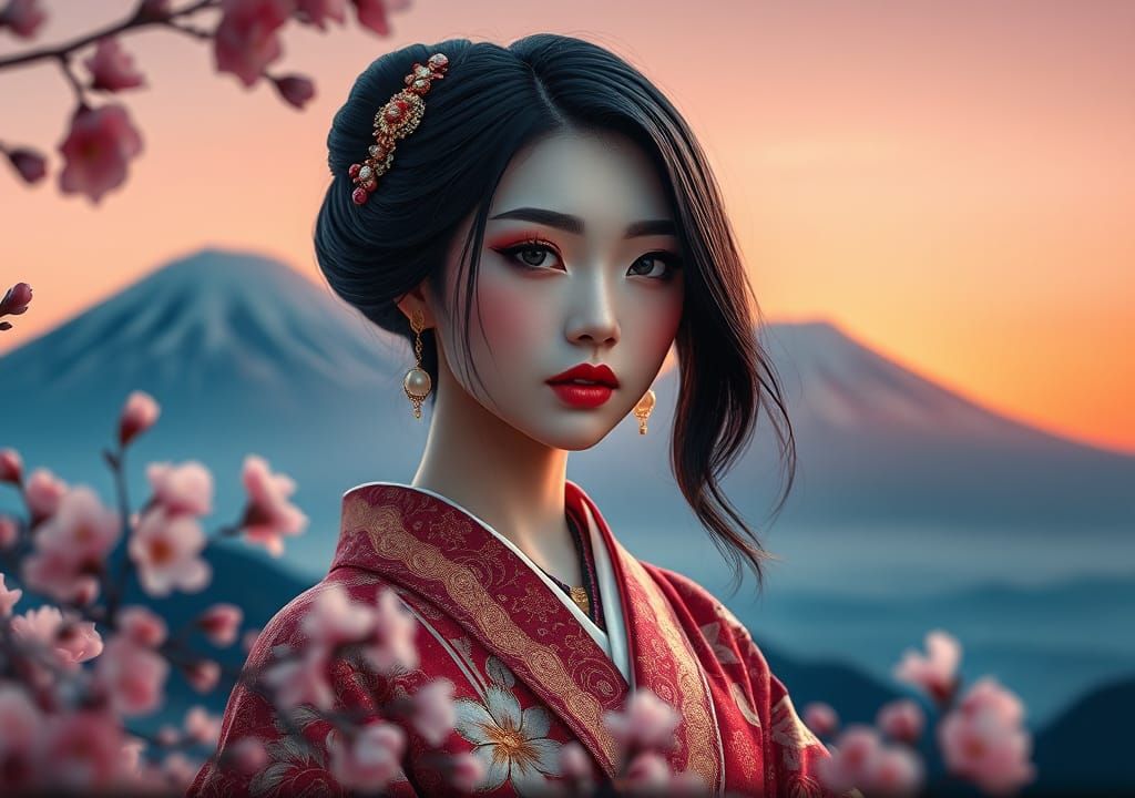 A hyperrealistic portrait of a Japanese woman in traditional attire against a Mount Fuji backdrop. The image showcases vibrant colors, dynamic lighting, and intricate details, reminiscent of Art Nouveau in a digital rendering.