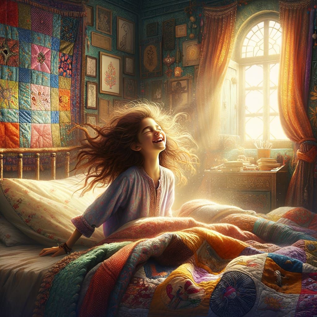 This image shows a sunlit bedroom scene rendered as a matte painting. A cheerful girl is stretching in her bed, surrounded by colorful quilts, toys, and whimsical illustrations. The artwork is richly detailed.