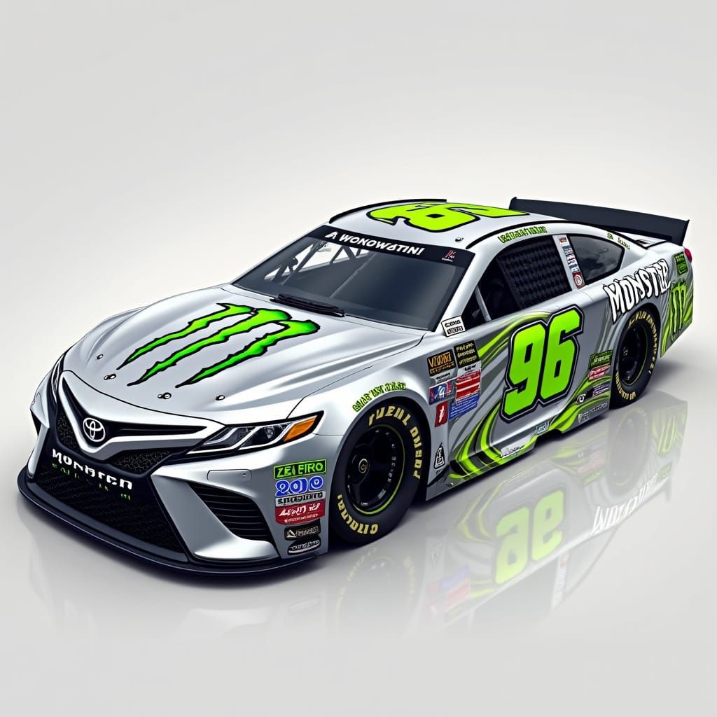 This image shows a #96 Gaunt Brothers Racing Toyota Camry NASCAR stock car. The car features a silver and white paint scheme and Monster Energy logos, rendered in photorealistic style.