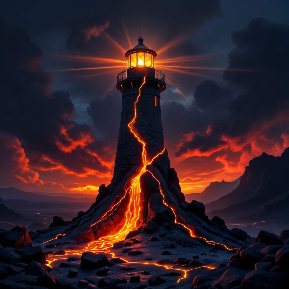 This striking image features a lighthouse sculpted entirely from flowing lava, dramatically pouring down from above.