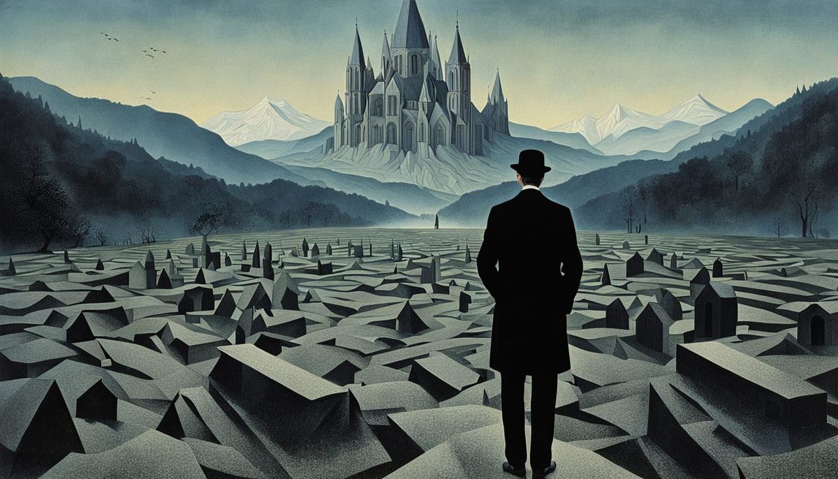 This image depicts a surreal flat landscape where cathedrals form the mountains. Rendered in a clear line art style with influences of Magritte and Delvaux, it evokes a dreamlike, slightly occult atmosphere.