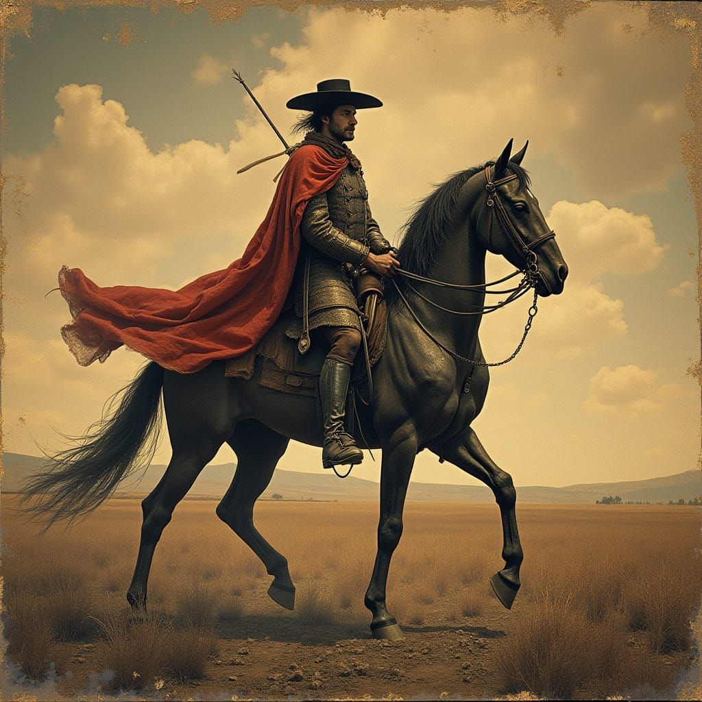 This image shows a knight on horseback, inspired by the fusion of baroque and surrealist styles, with a mix of texture and symbolism. A heroic figure contrasts with the decay of his surroundings, reflecting the tension between idealism and reality.