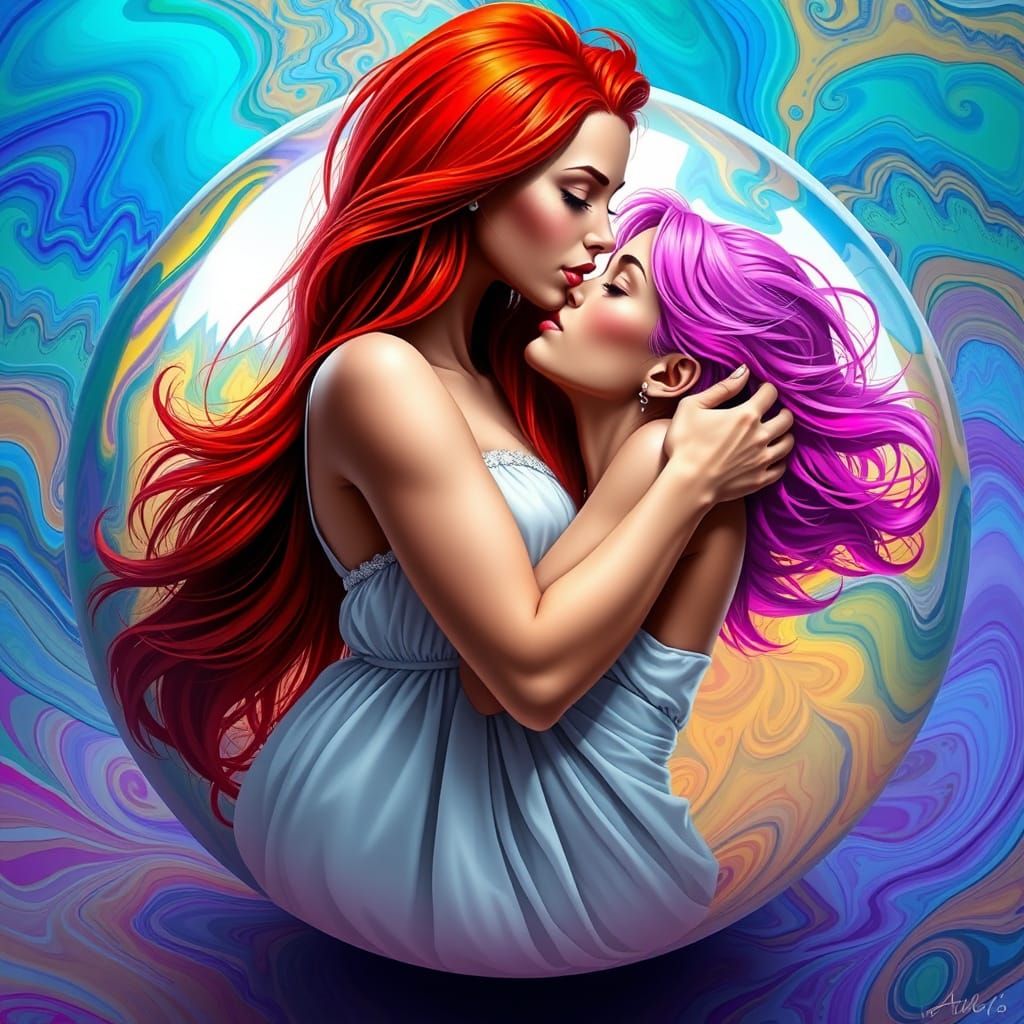 This image shows two women embracing passionately inside a vibrant, swirling marble orb. The artwork features digital painting and 3D rendering to create a dynamic and colorful scene.