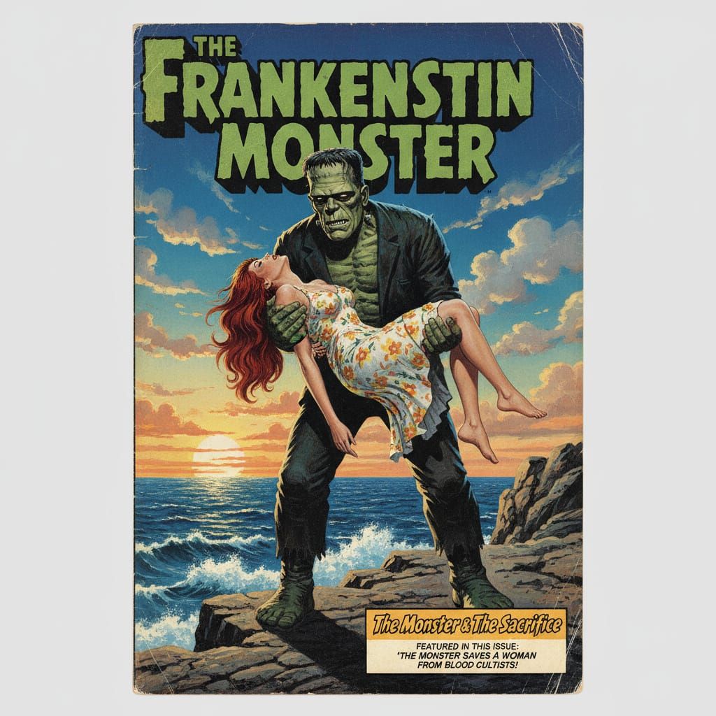 This image shows a vintage comic book cover featuring the Frankenstein Monster carrying a woman on a cliff. The artwork evokes a retro aesthetic with vibrant colors, reminiscent of fantasy art from the 1970s.