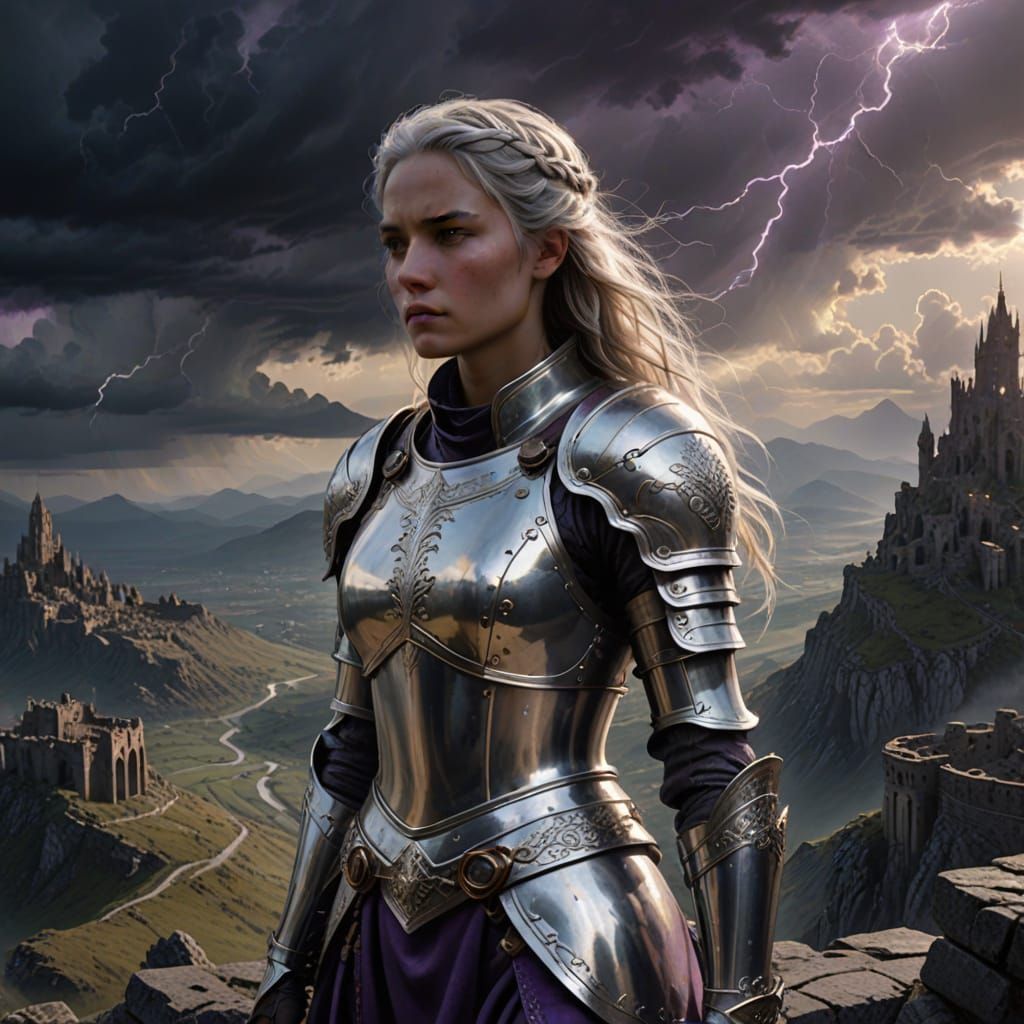 This image shows a knight in silver armor atop a mountain, gazing at a ruined city. The scene, with white hair blowing in the wind, features a stormy sky and dramatic lighting, evoking a sense of mystery.