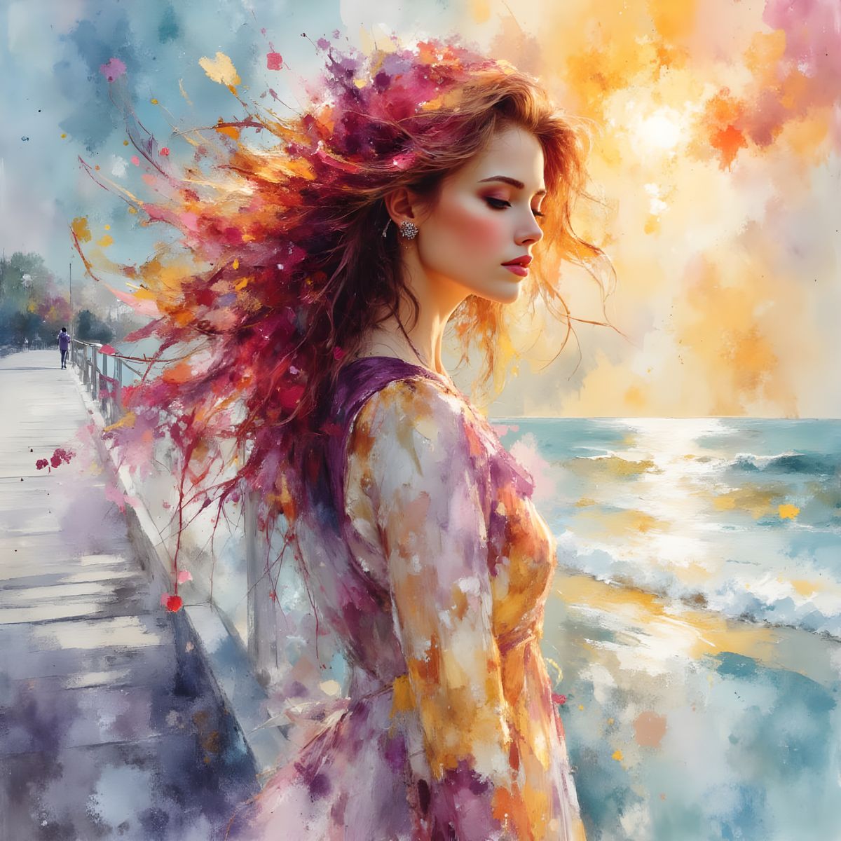A striking image of a woman with flowing hair on a boardwalk, rendered in a mixed media impressionistic style with vibrant colors and a textured background, evoking a dreamy seaside atmosphere.