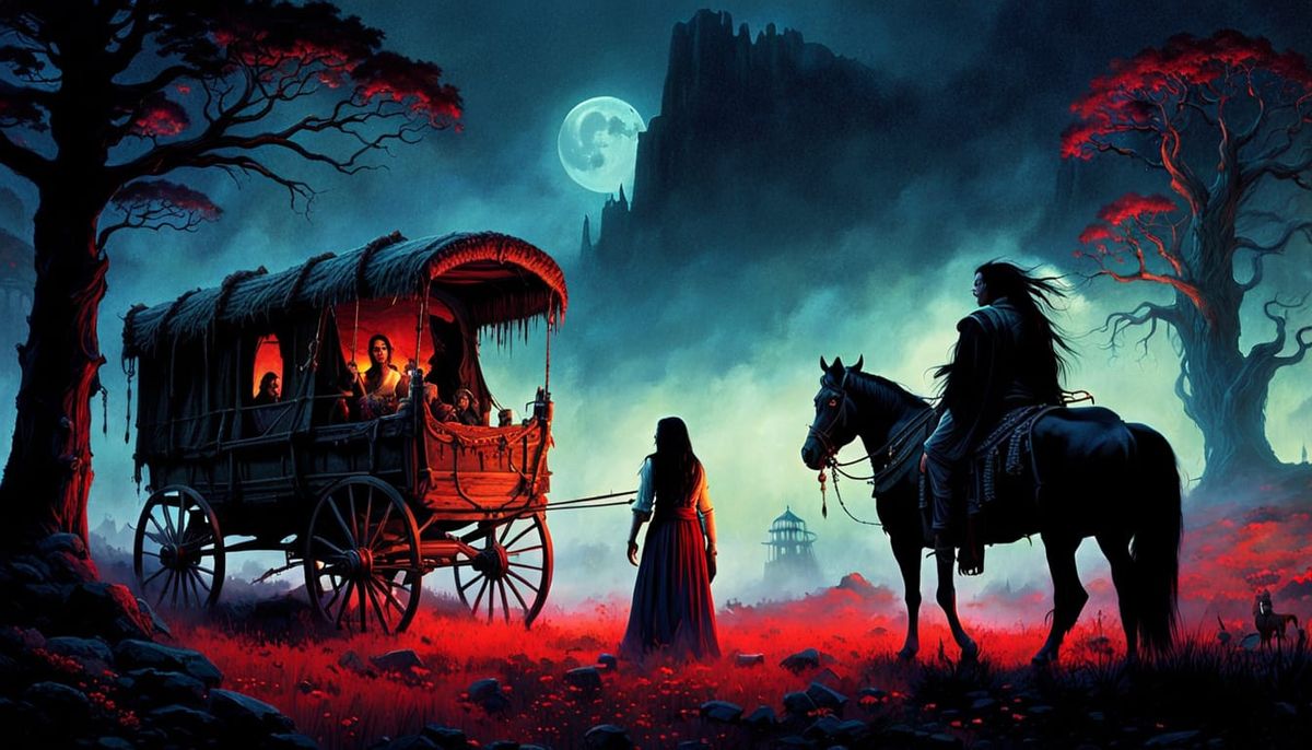 This image depicts a Native American vampire shaman approaching a gypsy woman near an old wagon. The scene features misty, moss-hung trees, horses, and dramatic lighting in a Studio Ghibli style.
