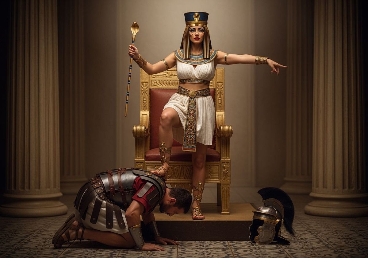 This image shows an Egyptian queen in her throne room, stepping on a kneeling Roman soldier. She wears a golden toga, cobra crown and bejeweled sandals. The photograph employs natural lighting and a bokeh effect.