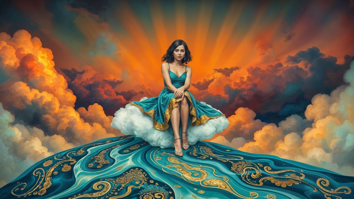 A striking picture of a young woman in a dress sitting on a cloud. The image features a fantastical river of liquid metal with intricate patterns in a storybook illustration style with watercolor and ink effects.