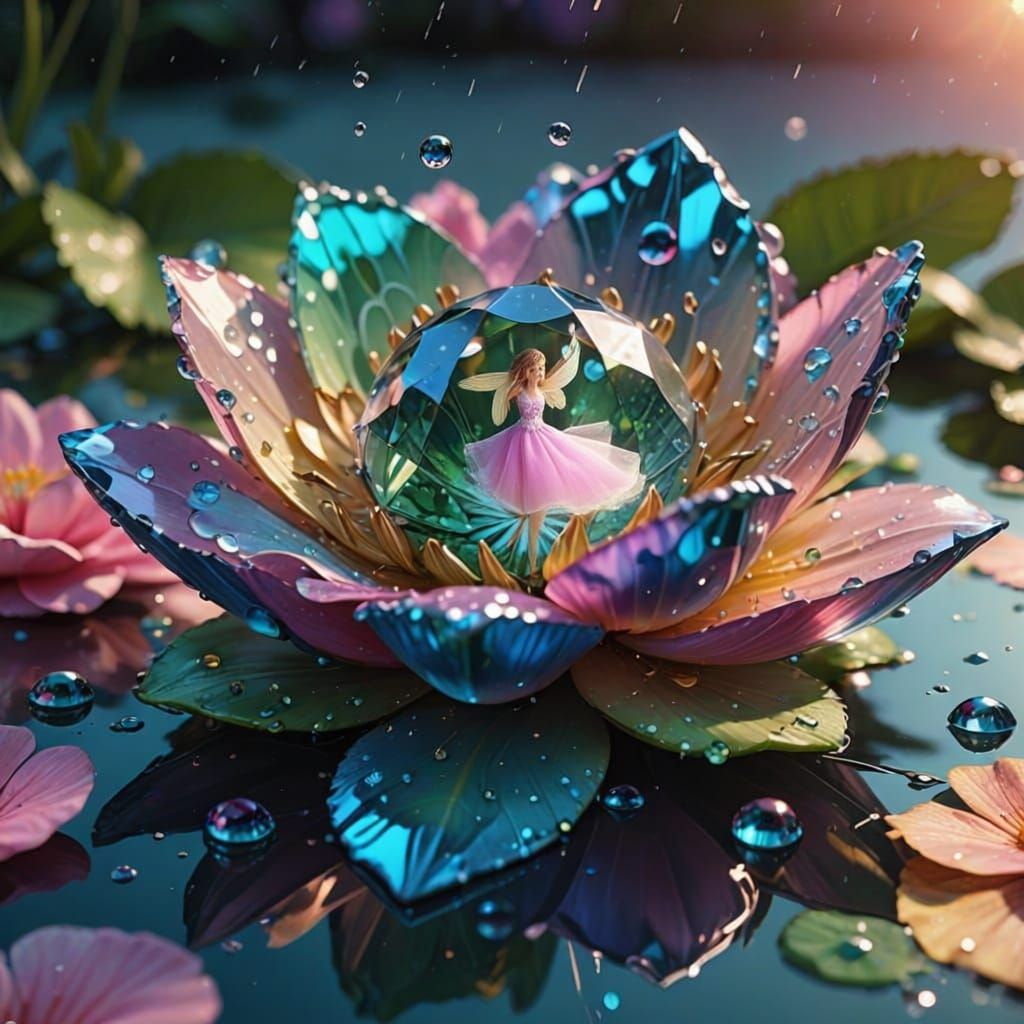 Generate your own magical enchanted gem images, tiny like teardrops, suspended in flower petals at dawn. It's free and easy!