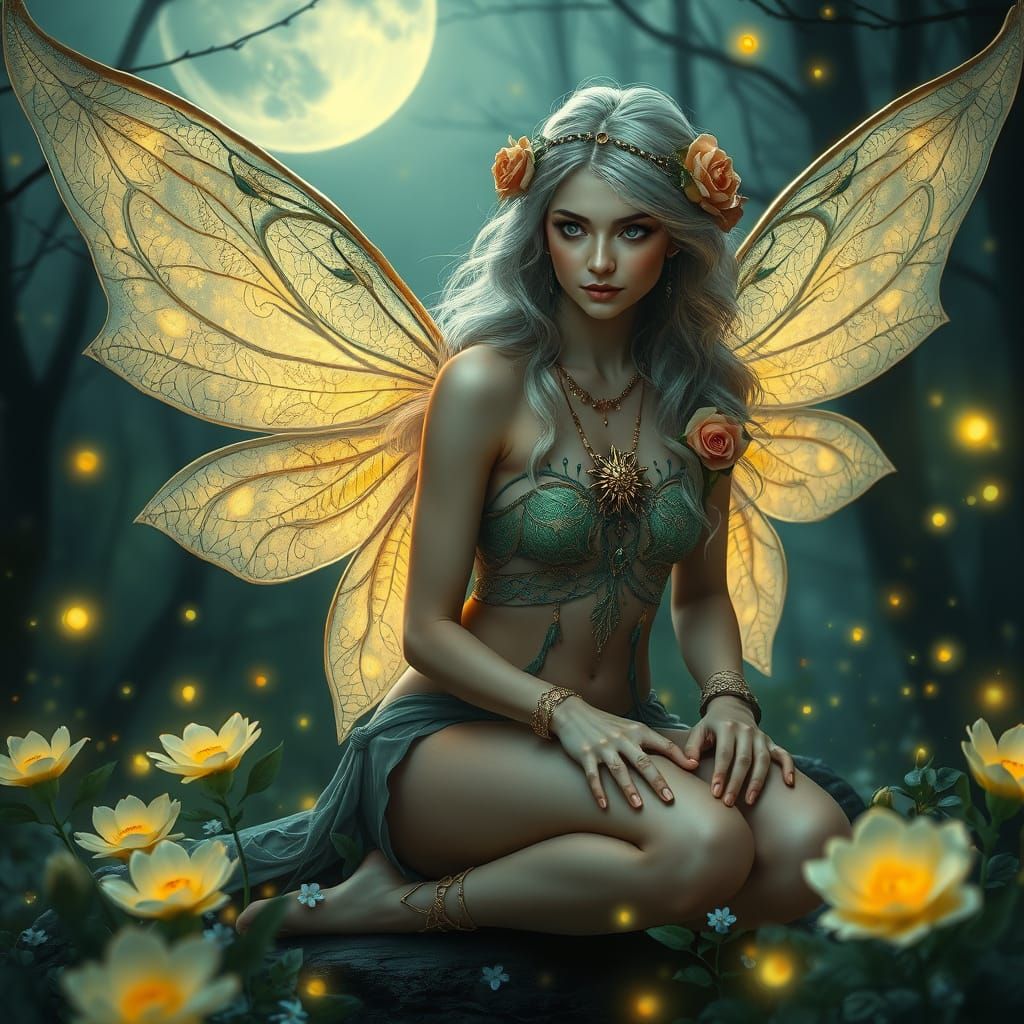 A captivating image of an elven fairy in a moonlit forest. The fairy is adorned with bronze jewelry and roses, with wings like textured leaves, all rendered with hyper-realistic detail in a mystical atmosphere.