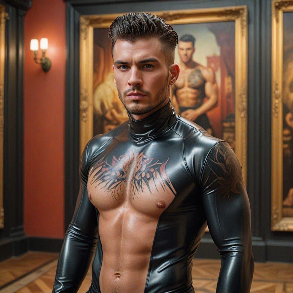 A hyper-realistic digital artwork featuring a handsome man with a mohawk and tattoos, confined within a glass box. The setting is a museum with elegant architectural details, rendered with soft lighting and a warm color palette.