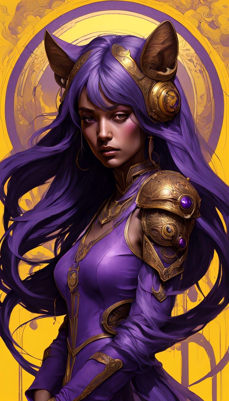 A stunning depiction of a female alien warrior in a dynamic pose, clad in intricate sci-fi armor, set against a dark fantasy backdrop, with vibrant purple and yellow hues.