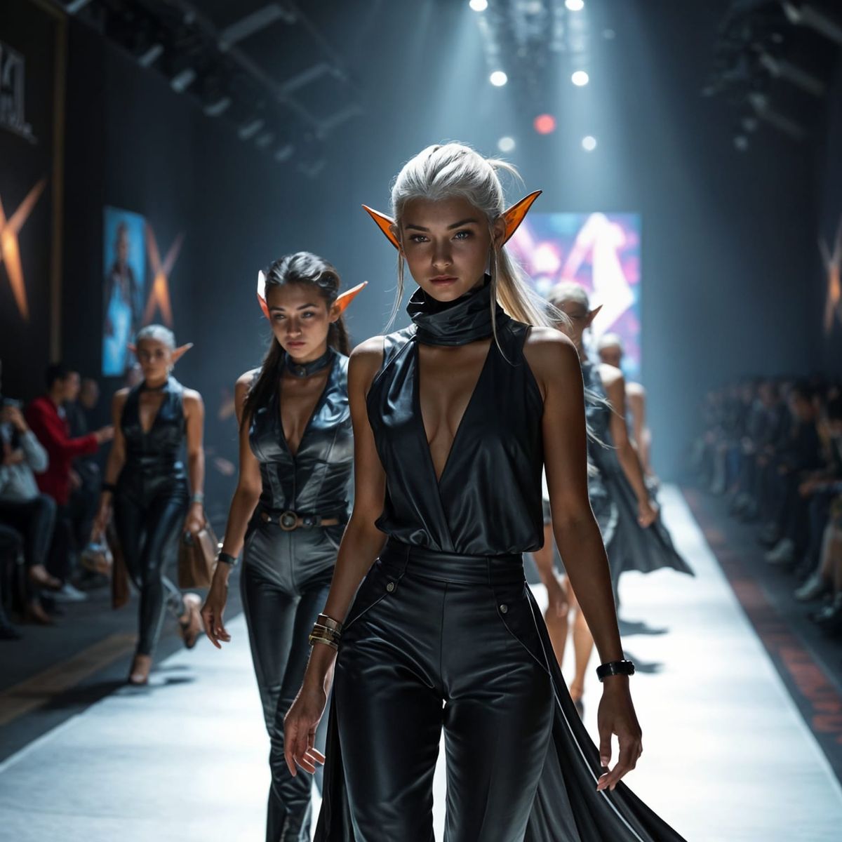 This image shows elven models with striking haircuts and ethereal beauty walking down a fashion runway. The photograph captures high fashion in dramatic lighting, with atmospheric effects creating a cinematic feel.