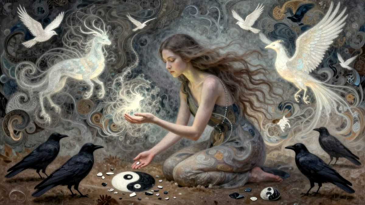 This image shows a serene woman gathering glowing Yin and Yang shards amidst ethereal creatures and swirling organic patterns. It features a dreamlike, surreal atmosphere with intricate textures and symbolic elements.