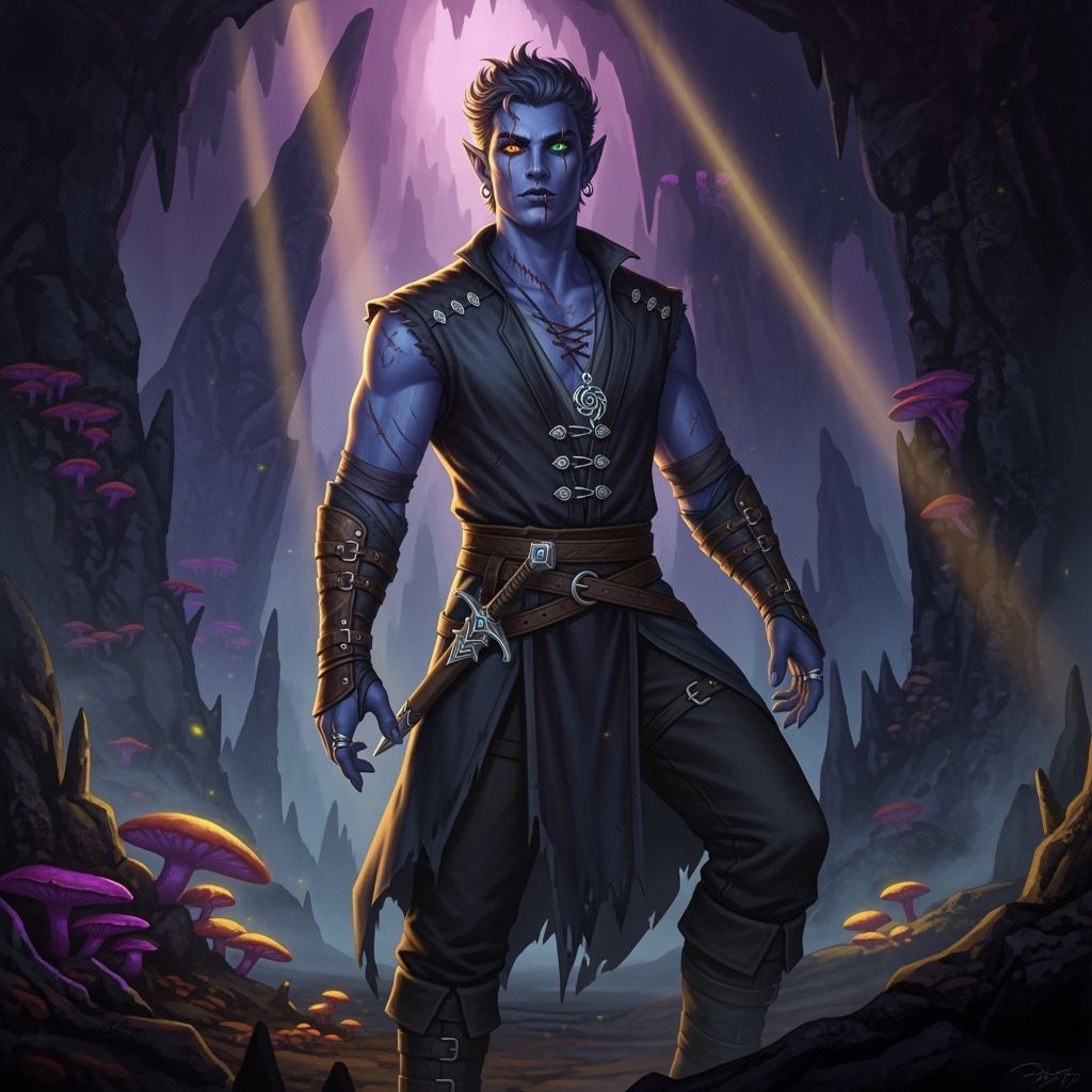 A striking picture of a male drow with deep blue skin and heterochromia. He has a scar on his neck and wears casual clothes. The image is rendered with dynamic lighting and vibrant colors.