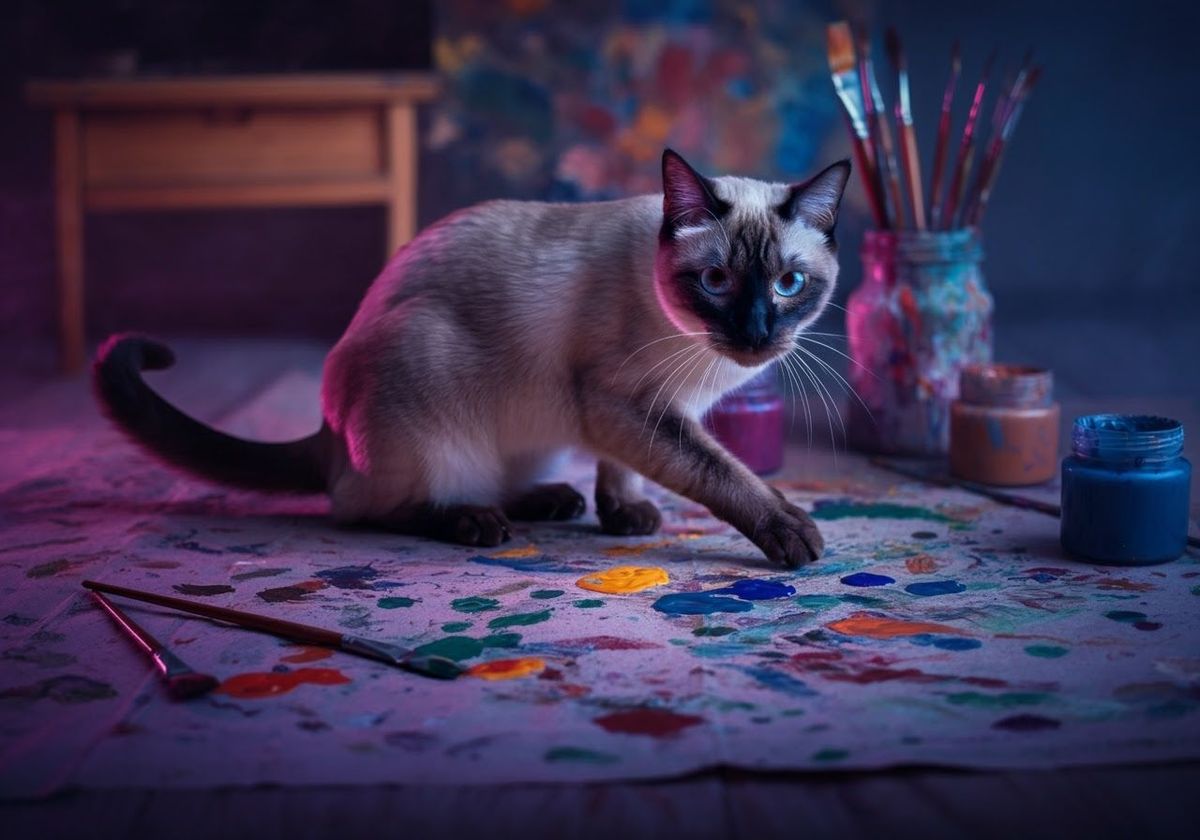 This image shows a siamese cat creating colorful paint footprints in an eccentric, playful art studio. The scene features intricate details, high contrast, and a moody, atmospheric synthwave neon aesthetic.