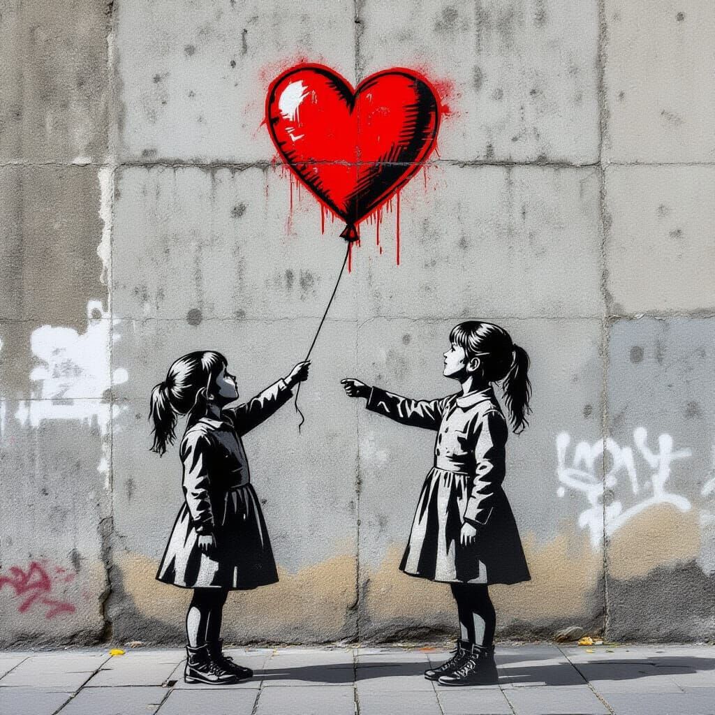 A poignant image of a girl releasing a red heart balloon against a stark urban backdrop. The artwork captures a street art aesthetic with stencil techniques, strong contrasts, and expressive elements.