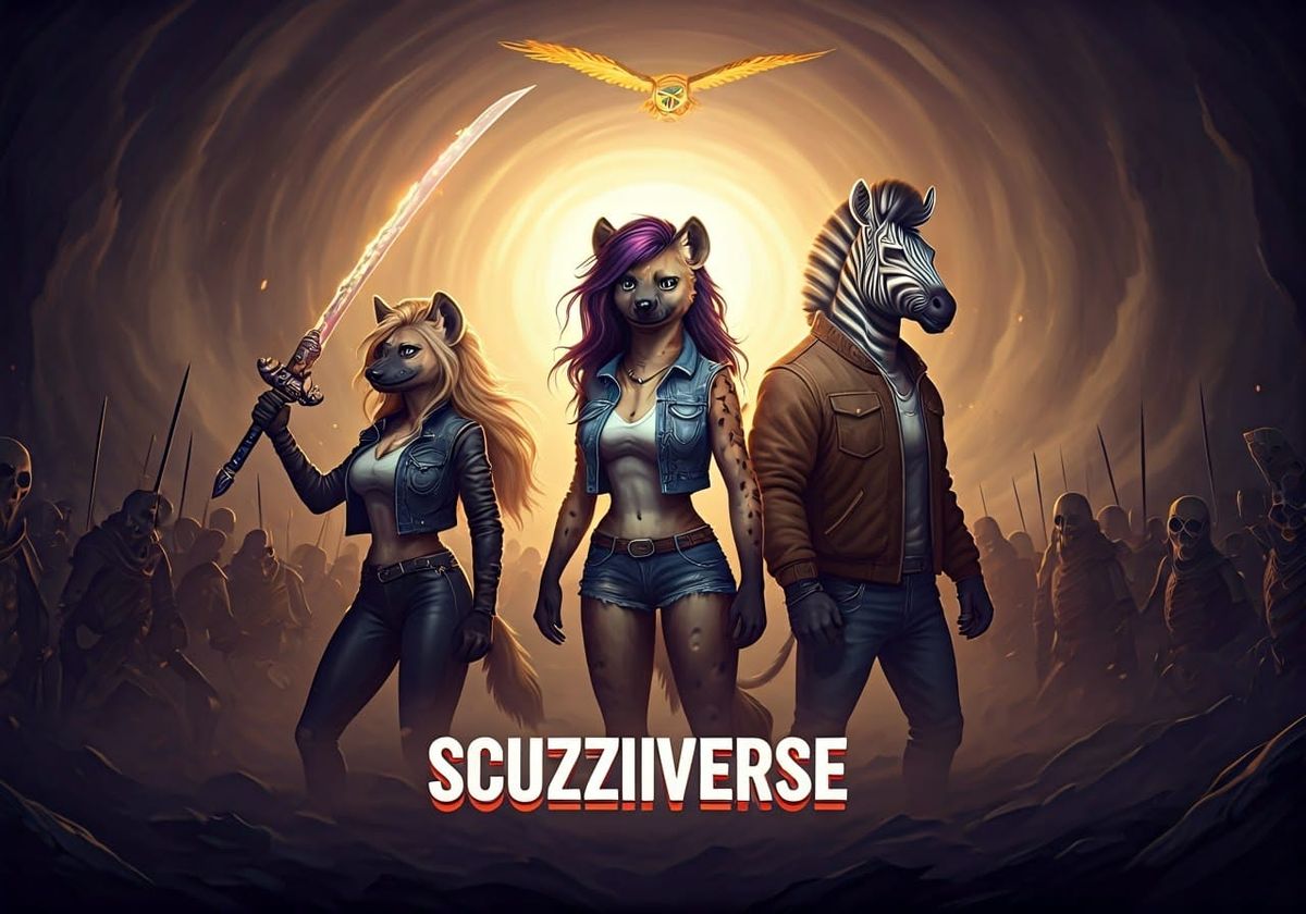This image shows a group of heroes standing against an army of skeletal warriors in a misty, eerie environment. The heroes are a lithe, feminine anthro hyena and two other anthro creatures, each wielding powerful swords and exuding toughness and sensuality.
