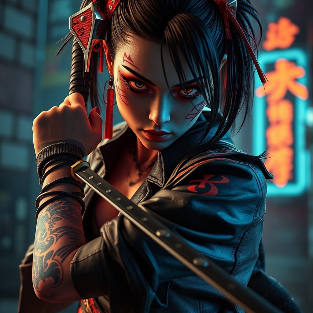 A striking picture of a cyberpunk geisha in a leather kimono wielding a katana. This photorealistic anime art features vibrant neon accents and gritty textures, with cinematic lighting.
