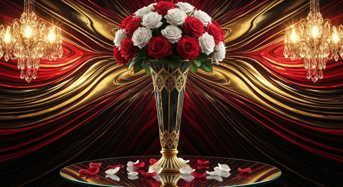 This image shows a stained glass vase with gold trim filled with red and white roses on a glass table. Rose petals surround the vase, set against an abstract backdrop with metallic patterns in a cyberpunk aesthetic.