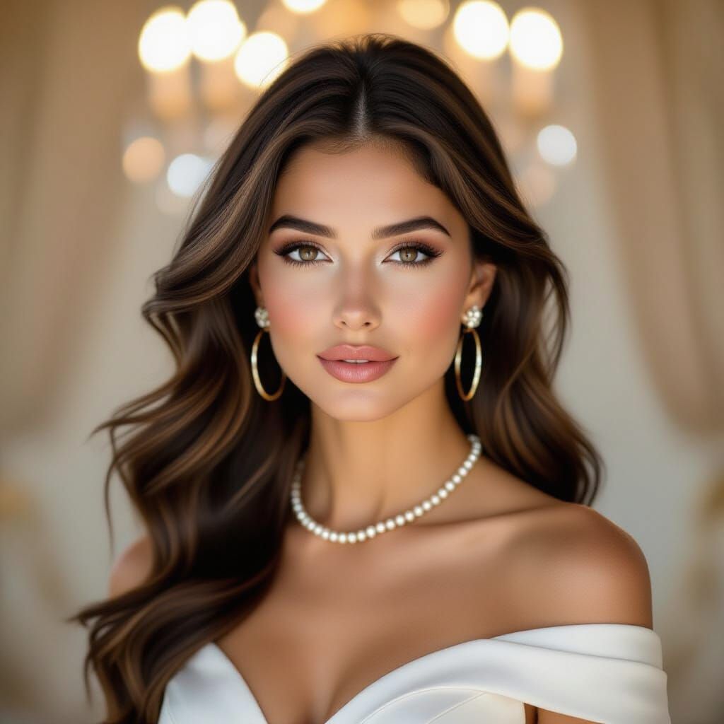 This image shows a close-up of a beautiful brunette woman in an off-shoulder dress, pearl necklace, and hoop earrings. Realistic style with cinematic lighting and shallow depth of field.