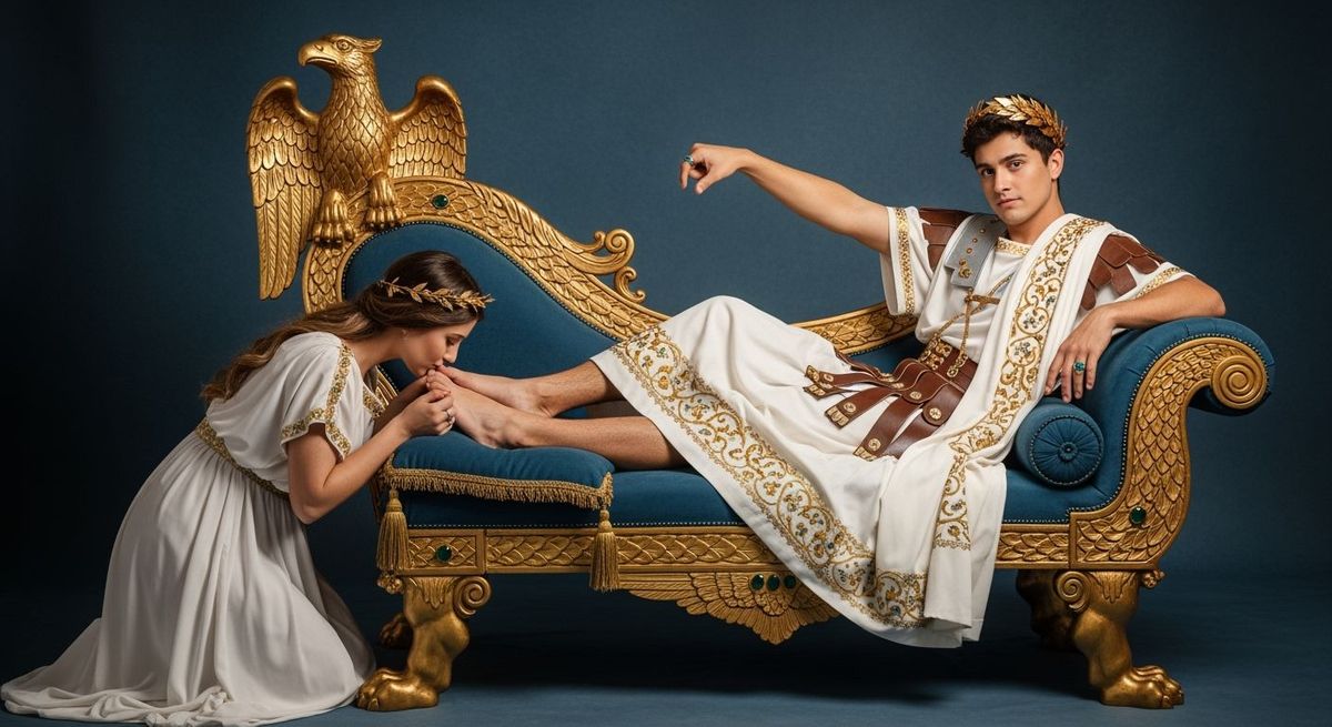 This image shows a young Roman emperor relaxing on a golden chaise lounge. A princess kneels to kiss his feet in this photograph-like image with sharp focus and natural lighting, reminiscent of Neoclassical art.