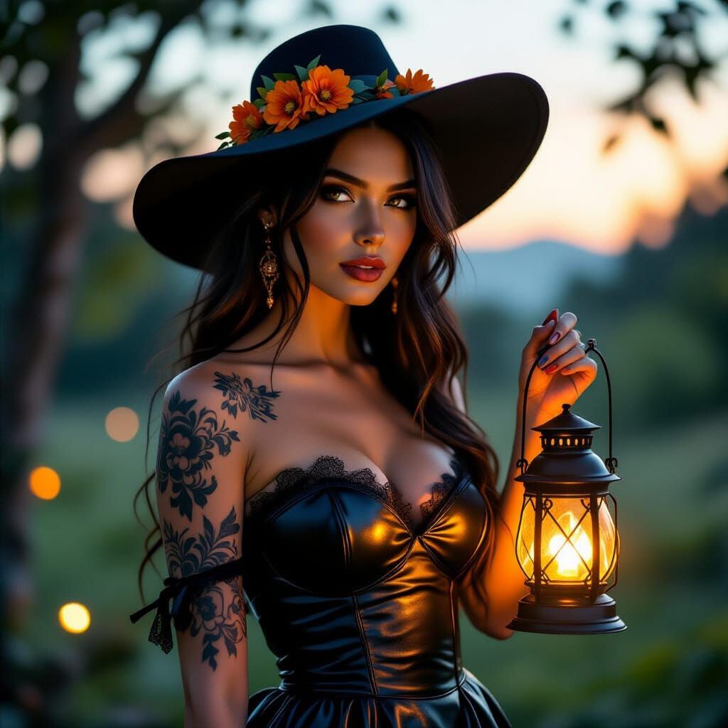 This image shows a woman in a black leather dress holding a lantern in a twilight forest. She has ornate tattoos and wears a wide-brimmed hat, all rendered with soft, ethereal lighting in a mystical, fairytale aesthetic.