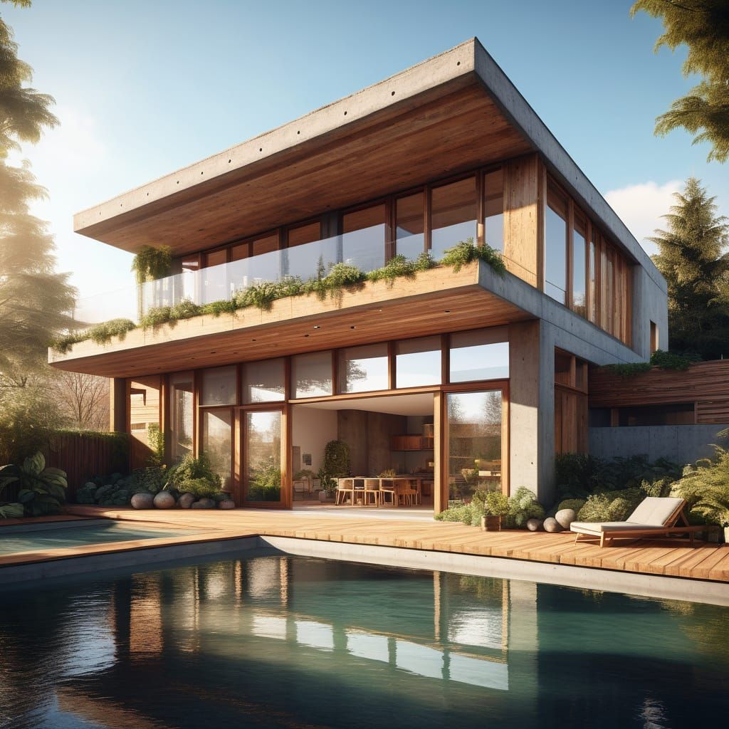 A modern two-story house featuring concrete and wood, complete with a winter garden, terrace, pool, and vibrant greenery. The architectural rendering showcases warm sunlight and natural materials.