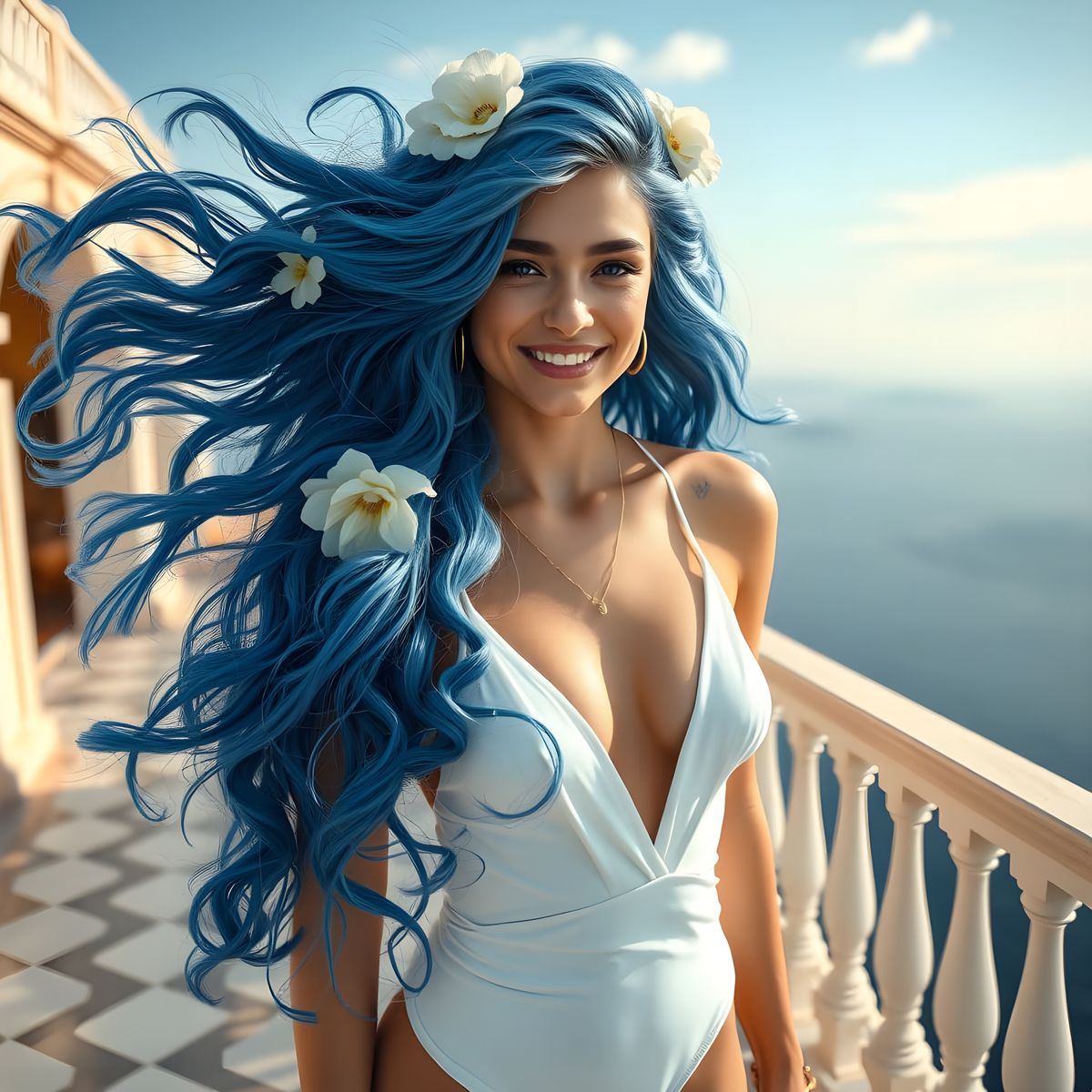 This image shows a beautiful Irish woman with flowing blue hair smiling on a balcony. The image is highly detailed with cinematic lighting and a photorealistic aesthetic.