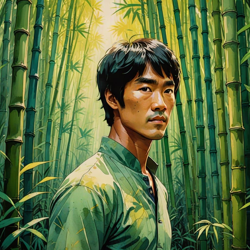 This image shows Bruce Lee in a bamboo forest, rendered in a Studio Ghibli-inspired style. The vibrant watercolor art features soft brushstrokes and warm colors, illuminated by gentle light.