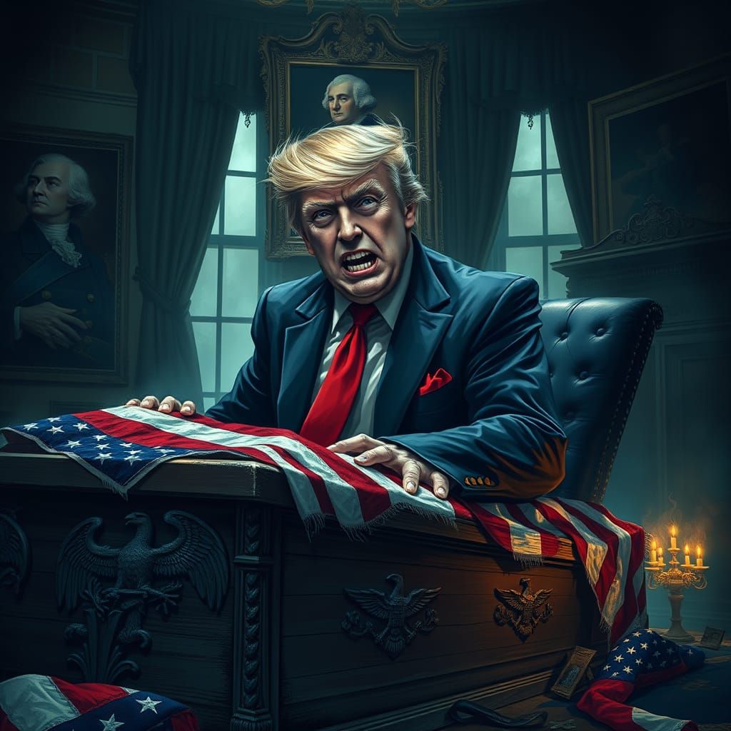 A haunting image of a vampire Donald Trump rising from his coffin in the Oval Office, surrounded by tattered flags, shattered wood, and eerie shadows, in a dark and ominous atmosphere inspired by Gustave Doré and Greg Rutkowski's gothic sensibilities