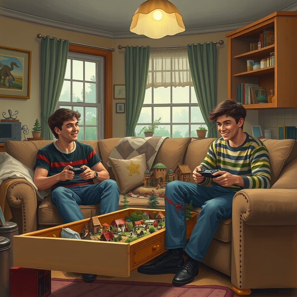 This image shows two young men playing video games in a cozy 1980s house. A kitchen drawer reveals a miniature medieval village with tiny people, rendered in an impressionistic style.