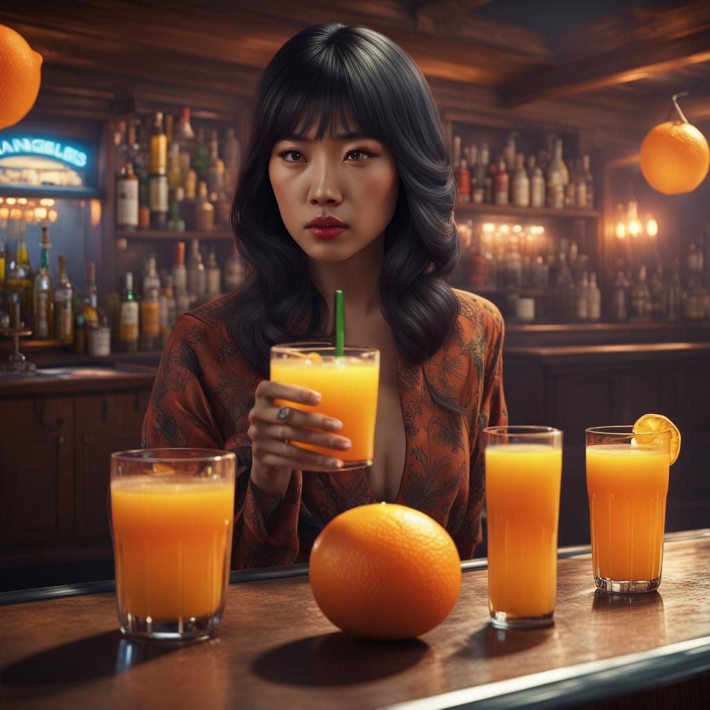 This image shows an Asian woman in a 1970s-style Los Angeles bar, drinking orange juice. The photorealistic digital painting features deep colors and intricate details, reminiscent of concept art.