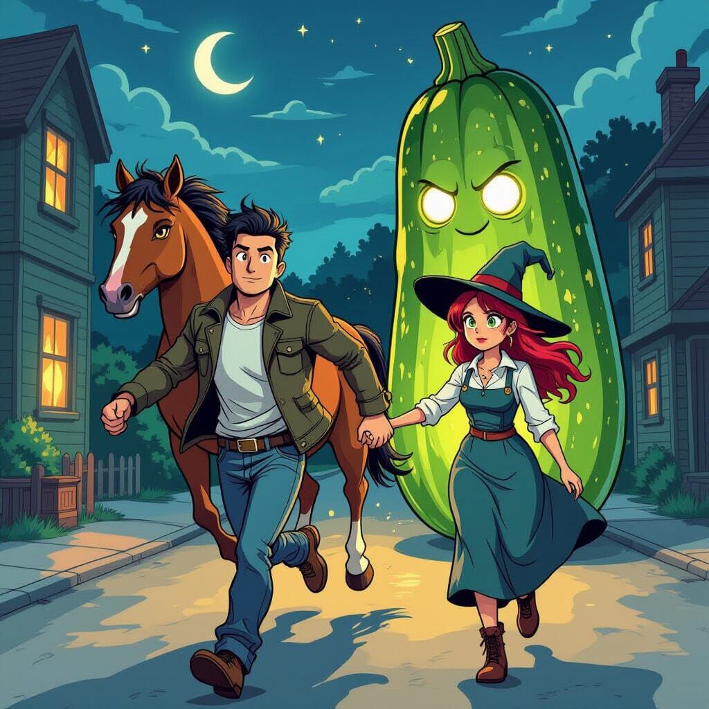 This image shows a horse-headed man in jeans fleeing a glowing-eyed zucchini with a crimson-haired woman in tow. It's a vibrant anime-style scene, dynamically detailed under a dark sky.