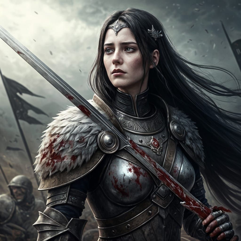 This image shows a stunning portrait of a noble princess warrior in a poignant, grief-stricken moment, showcasing intricate details and a regal presence, amidst a dramatic battlefield backdrop.