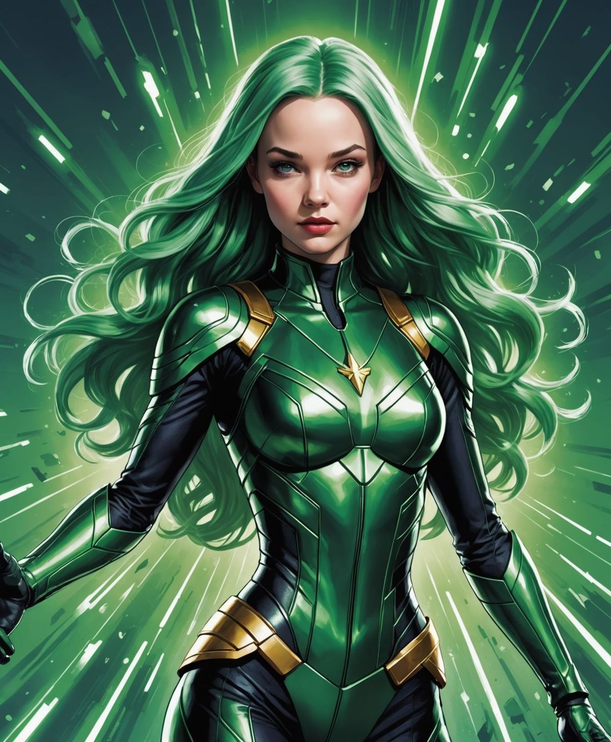 A concept look portrait of actress Dove Cameron with green hair and the power to manipulate magnetic fields and metals, as Polaris, Mistress of Magnetism, from Marvel's X-Men universe.