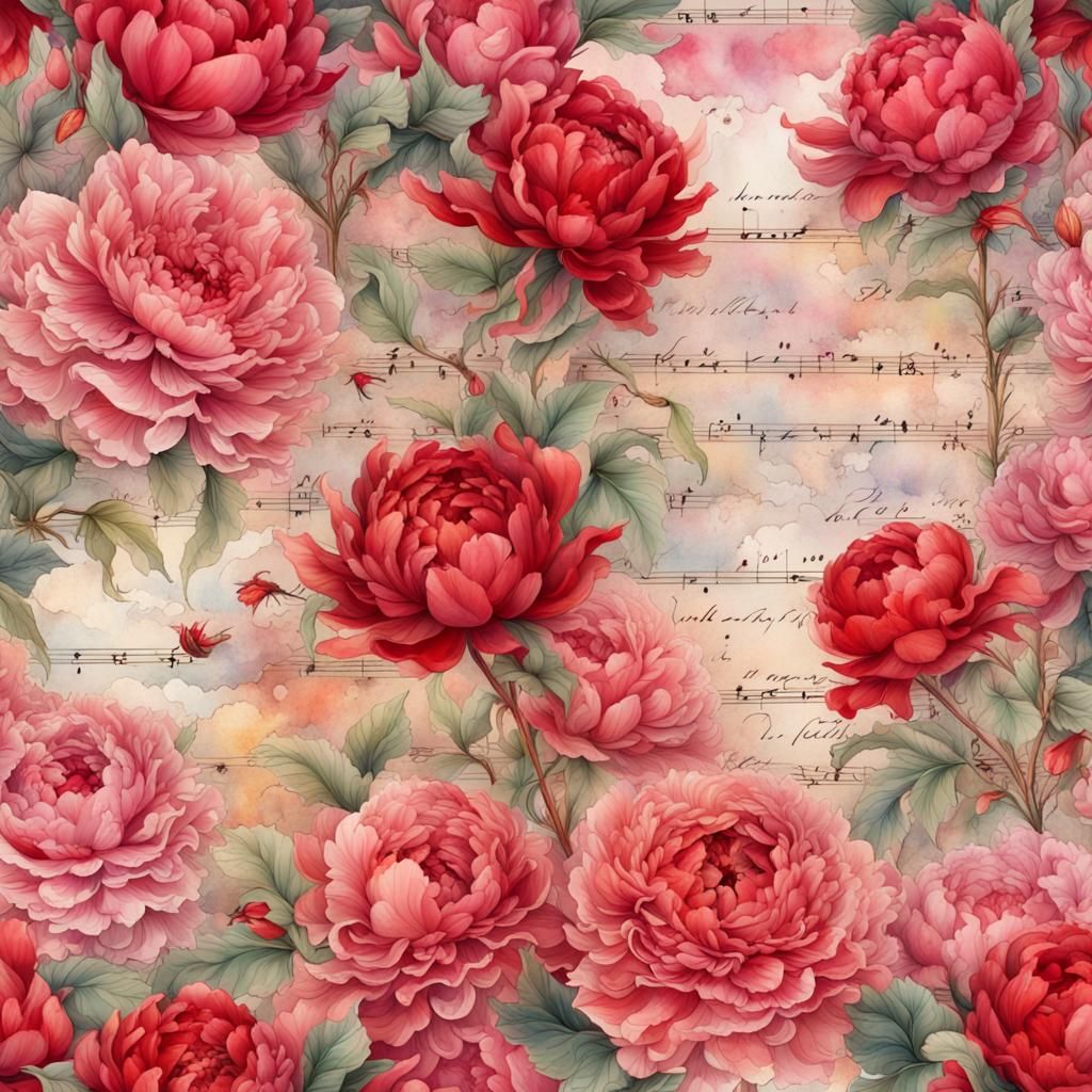 This image shows a journal page background, lined in the center and framed with red and pink peonies and small foliage. The image is detailed and fantastical, with a watercolor filter.