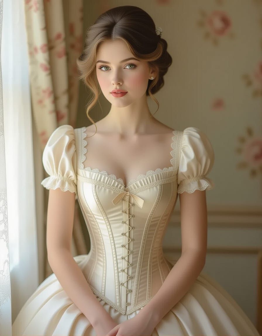 A photorealistic, high-resolution portrait of a beautiful Victorian woman in an elegant corset and undergarments. Soft, diffused lighting mimics late 19th-century photography with a shallow depth of field.