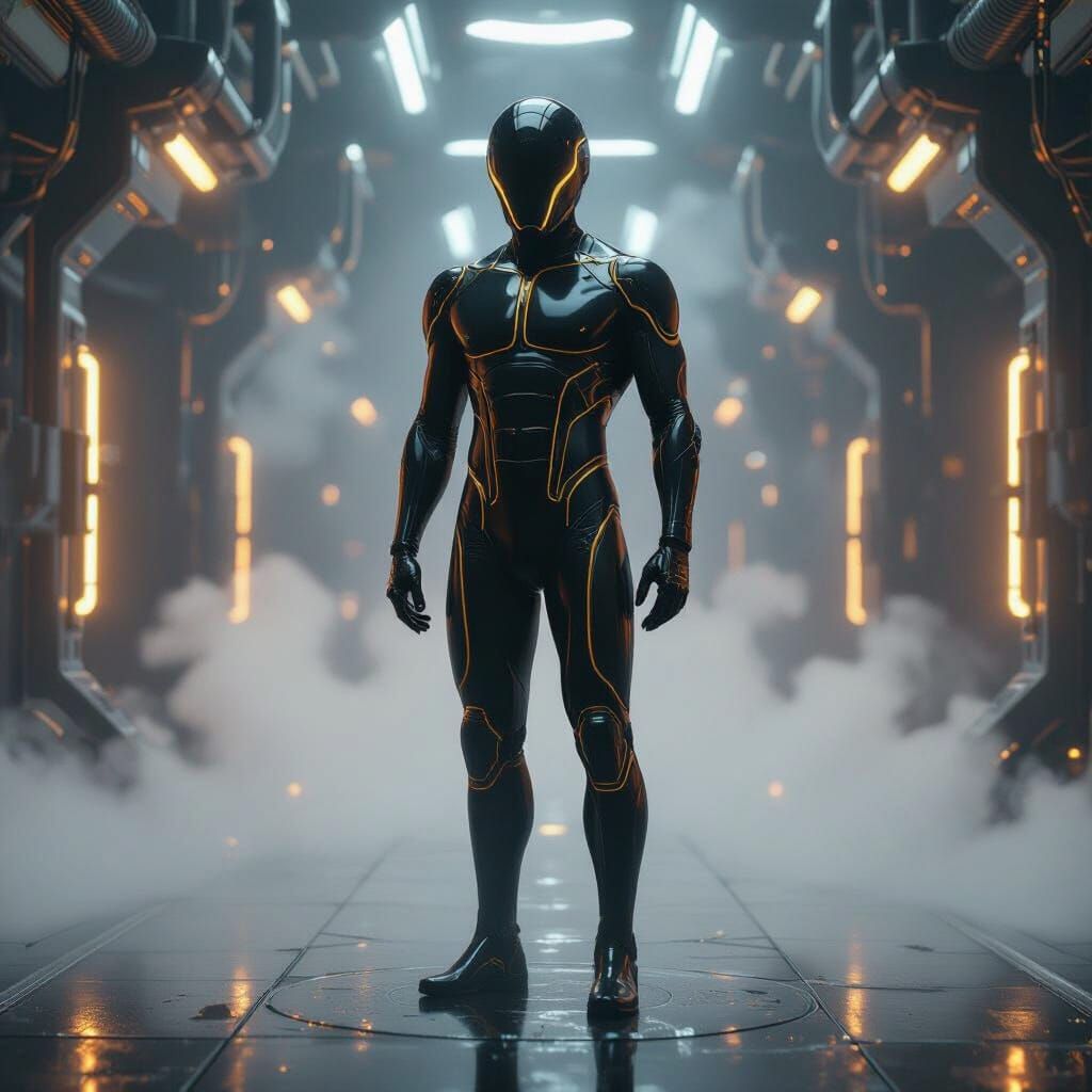 A digital artwork of a male drone in a black and gold uniform standing in a futuristic conversion room. The image blends industrial and biomechanical elements with a dark, golden glow in a futuristic aesthetic.