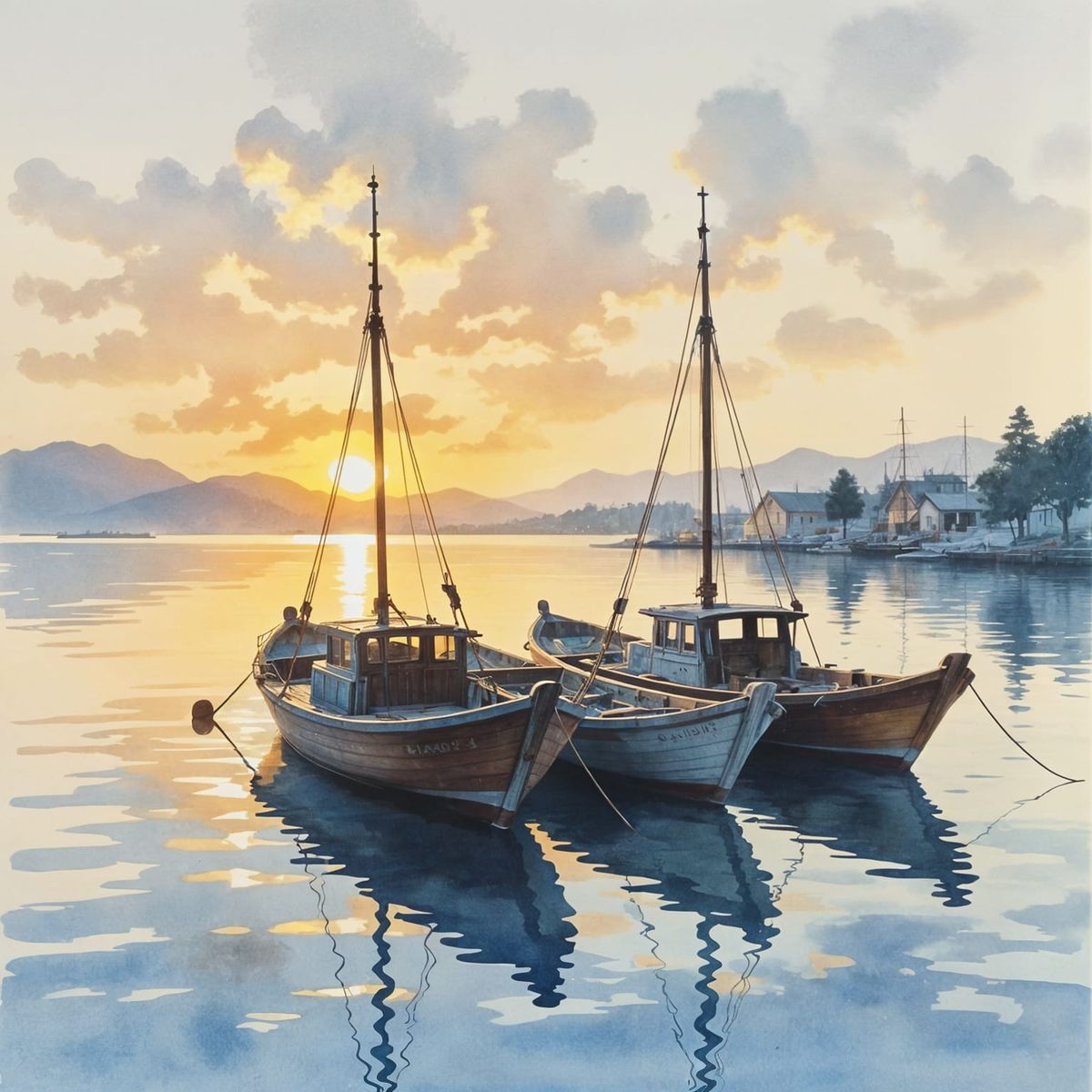This image shows old wooden boats in a serene harbor at sunset, painted in a Japanese watercolor style with a muted blue and gold palette. It evokes a calm, still atmosphere with visible brushstrokes and paper texture.