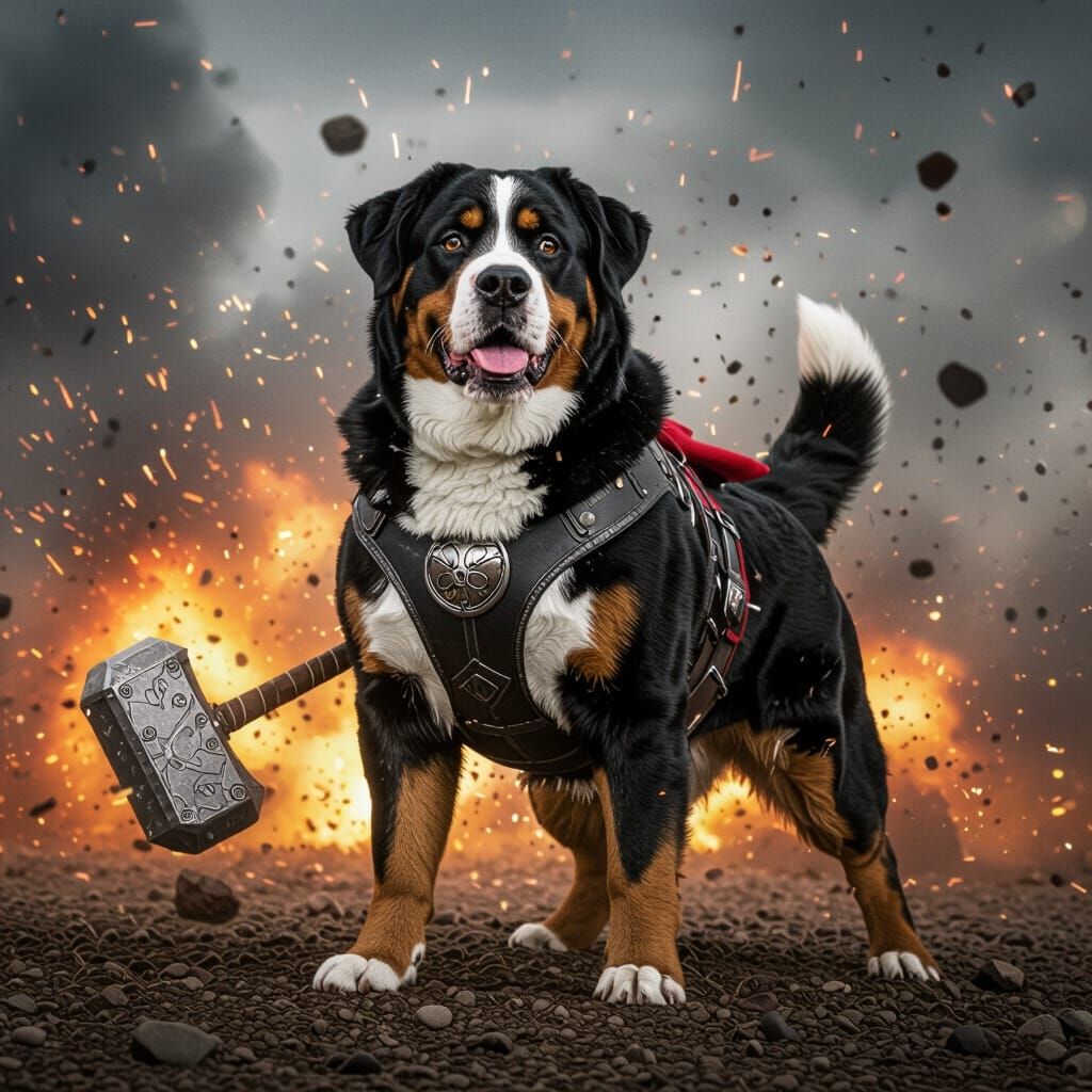 A photograph portrait of an obese bear-Thor depicted as a Greater Swiss Mountain Dog, set against a backdrop of explosive darkness. This image captures a unique, powerful portrayal.