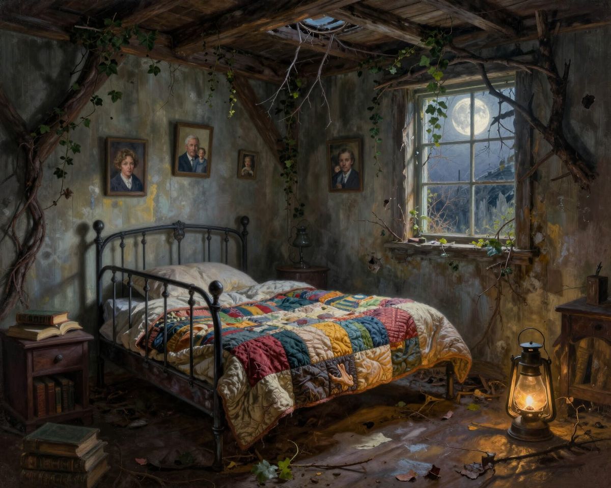 This image depicts a neatly made bed in a gloomy, abandoned cosmic room. Moonlight casts yellow shadows, highlighting decaying details and a sense of past occupancy, rendered with intricate, dynamic lighting.
