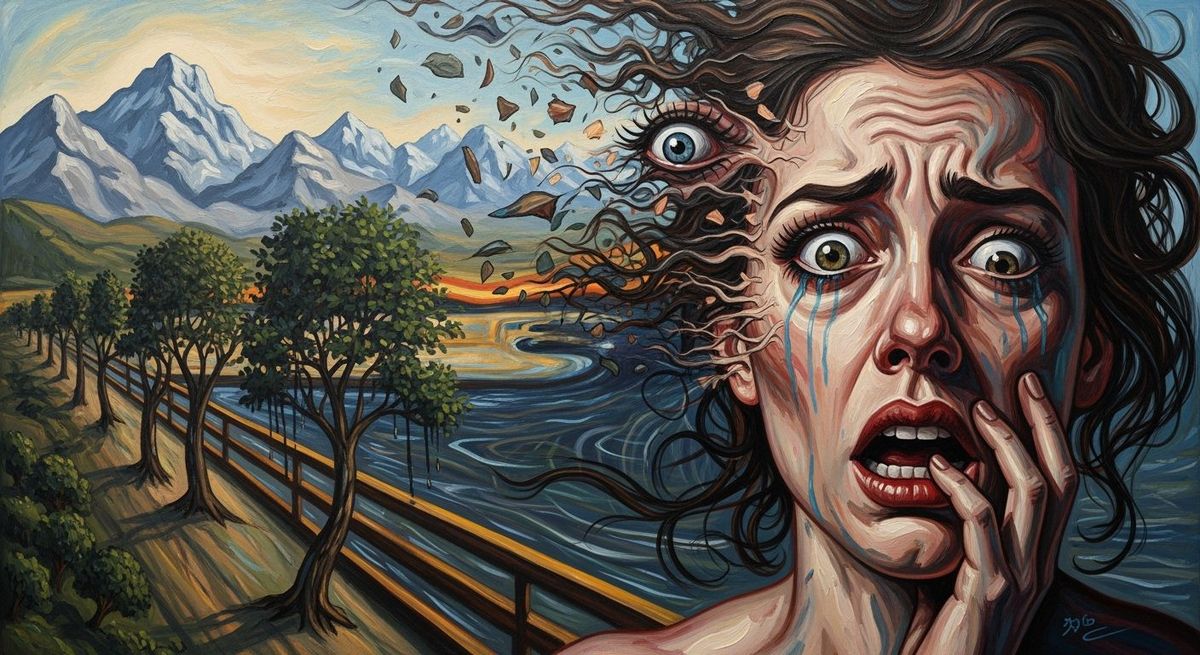 A striking picture of a woman's face expressing emotional turmoil. The impasto-style painting features distorted features and swirling brushstrokes, with mountain peaks twisting into lines of anguish. The trees weep with painterly despair, in dark blue and brown.