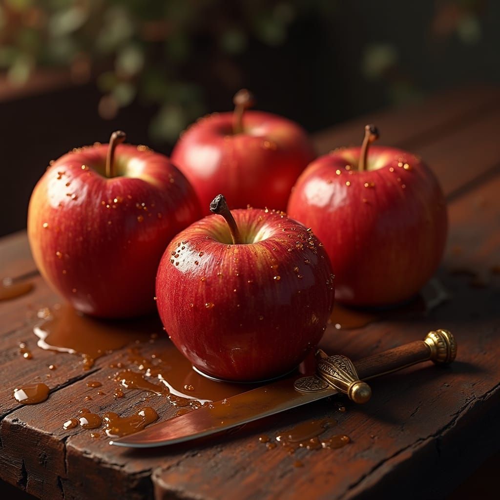 This image features a still life of vibrant red apples smothered in golden caramel, placed on a richly textured wooden table with an ornate gilded dagger. The warm, honey-toned light casts intricate shadows, highlighting the apples' rounded forms and the dagger's curved hilt in a hyper-realistic, Unreal ...